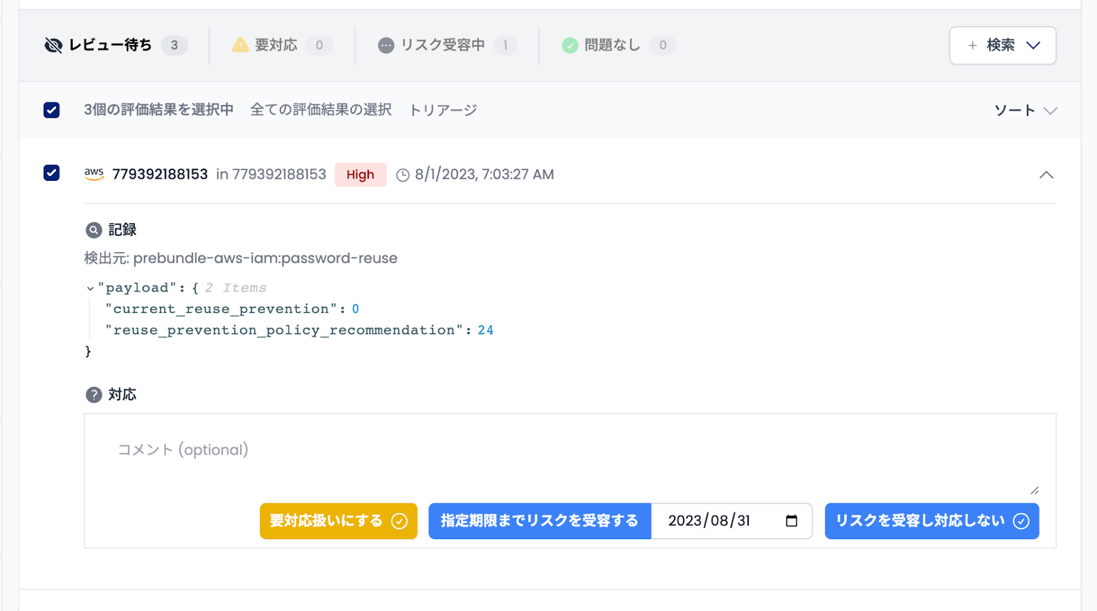 検出された個々のリスクを「Shisho Cloud」上で管理することが可能です。また、検出された各リスクに対しては「対応ステータス」「リスク判断」「対応方針」などの記録ができるようになっており、クラウドセキュリティを担うチームのノウハウ共有やタスク管理に活用いただけます。
