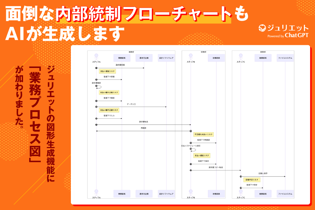 「業務プロセス図(内部統制フローチャート)」の作成は手作業が必要であり、その負荷が高かったため、この作業をAIが自動生成できるように開発したのが、今回の図形生成AIの「業務プロセス図(内部統制フローチャート)」への対応です。