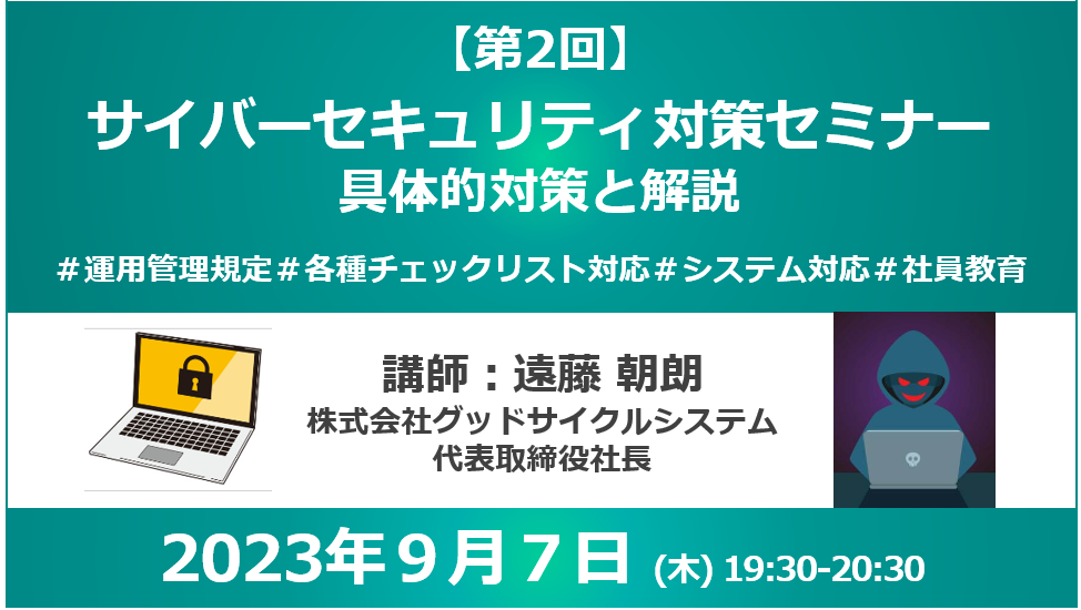 株式会社グッドサイクルシステム(本社:東京都渋谷区、代表取締役社長:遠藤 朝朗)は、薬局経営者・薬剤師向けにオンラインセミナーを無料で開催します。今回は、サイバーセキュリティ対策セミナーの2回目として、運用管理規定・各種チェックリスト対応・システム対応・社員教育など 「薬局で必要となるセキュリティへの具体的対策」について解説します。