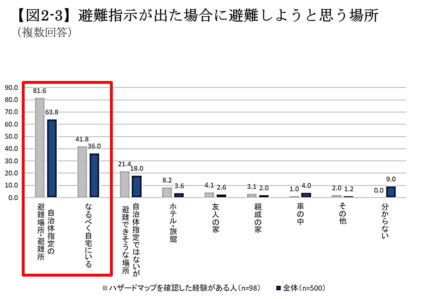 避難指示が出た場合に避難しようと思う場所は63.8%が「自治体指定の避難場所・避難所」と回答、次いで「なるべく家にいる」が36.0%でした。ハザードマップを確認したことがある人は81.6%が「自治体指定の避難場所・避難所」に避難すると回答し、全体の63.8%と比べると約18ポイント高い結果となりました【図2-3】。「自治体指定の避難場所・避難所」を選択しなかった人にその理由を聞くと「他の人と過ごすことに抵抗がある」(42.0%)が最も多く、他の選択肢と比べて約2倍となりました【図2-4】。