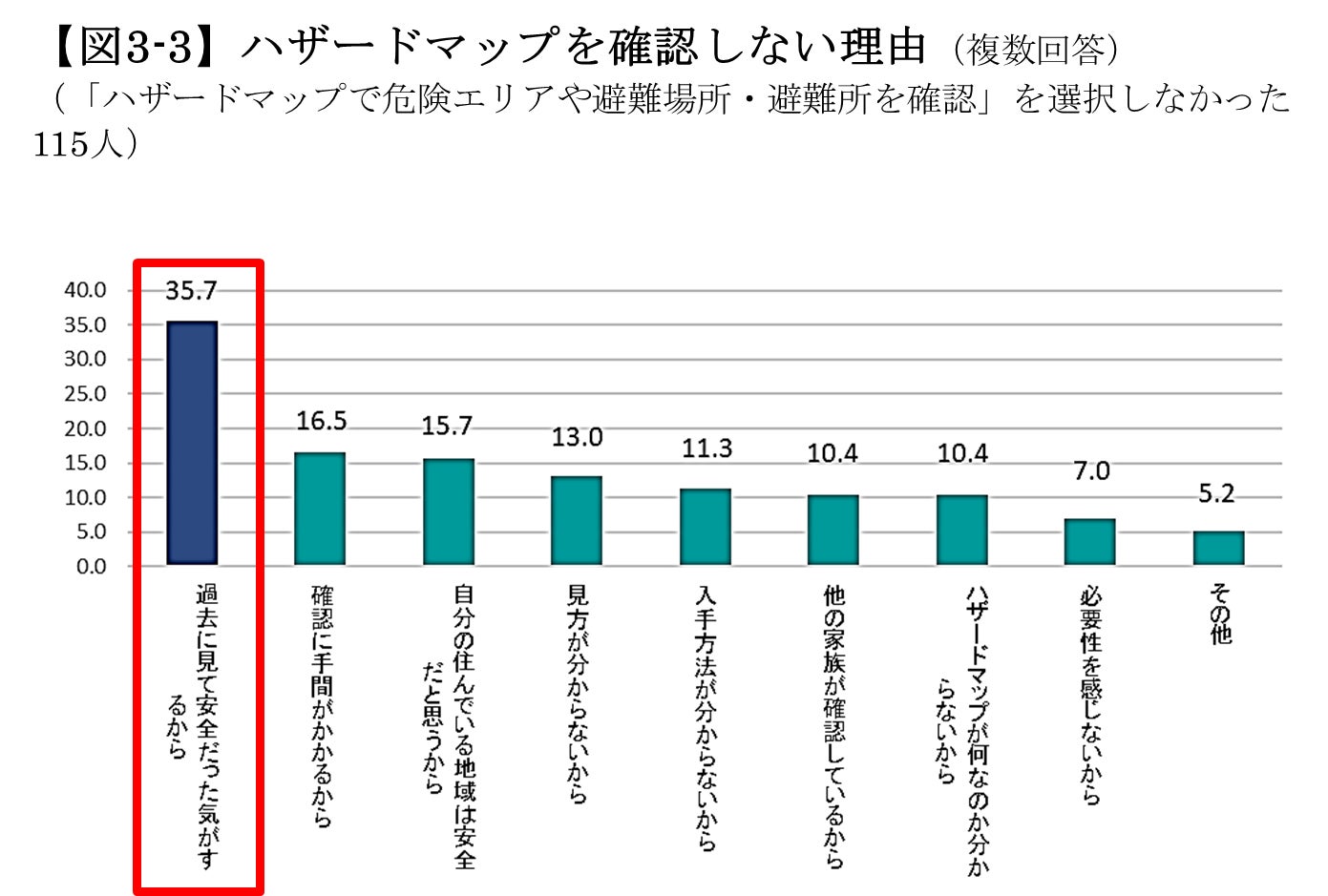 また、防災対策をしているものの、「ハザードマップで危険エリアや避難場所・避難所を確認」していない人にその理由を聞いたところ、「過去に見て安全だった気がするから」が35.7%と最多でした【図3-3】。