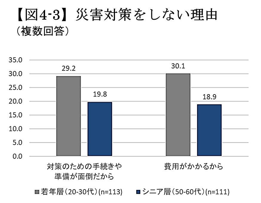 「防災対策をしていない」と答えた若年層に、その理由を聞いたところ、「対策のための手続きや準備が面倒だから」「費用がかかるから」と回答した人が約3割で、これはシニア層よりも約10ポイント高い結果です。若年層はシニア層に比べ手間や費用から防災対策を負担に感じる割合が高いことが分かりました【図4-3】。