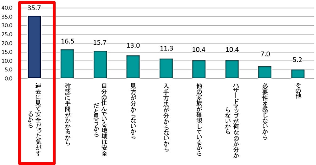 ●防災対策をしている人で、ハザードマップを確認していない人の理由1位は「過去に見て安全だった気がするから」(35.7%)。