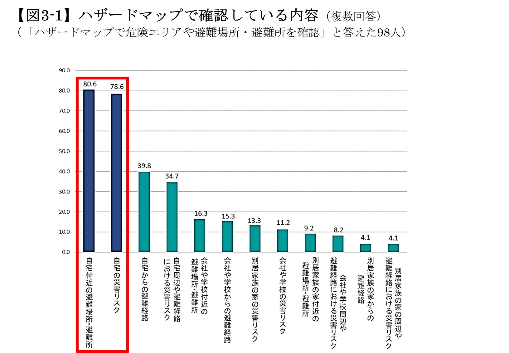 防災対策として「ハザードマップで危険エリアや避難場所・避難所を確認」していると答えた人に、確認している項目を聞くと、「自宅付近の避難場所・避難所」(80.6%)、「自宅の災害リスク」(78.6%)が上位となりました。った一方、「自宅からの避難経路」(39.8%)、「自宅周辺や避難経路における災害リスク」(34.7%)まで確認している人は4割を下回り、実際に避難する時のことを考えてハザードマップを確認している人はリスクまで想定できている人は少ないことが分かりました【図3-1】。