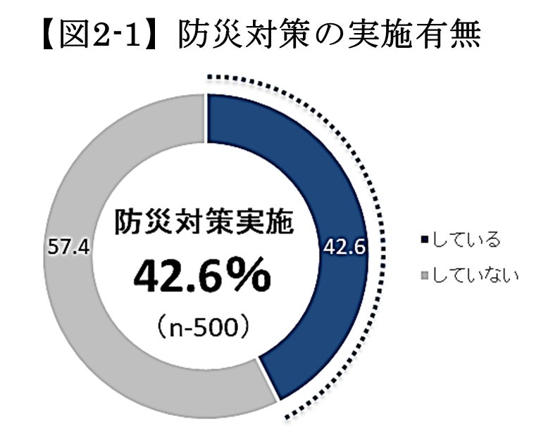 防災対策をしているか聞いたところ、約6割が「防災対策をしているない」(42.657.4%)と回答したのは約4割で、災害への危機意識が増加している一方で防災対策の実施率は低いことが分かりました【図2-1】。