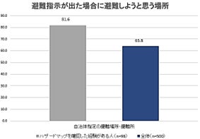 ●避難指示が出た場合に避難しようと思う場所は「自治体指定の避難場所・避難所」が63.8%、ハザードマップを確認した経験がある人では全体よりも約18ポイント高い81.6%にのぼった。