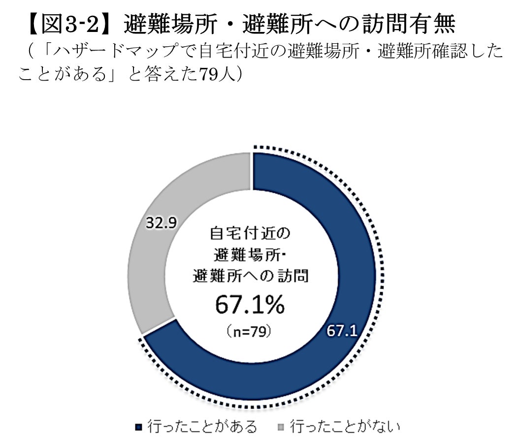 ハザードマップを確認したことがある人に実際に避難場所・避難所に行ったことがあるかを聞くと、「自宅付近の避難場所・避難所」に行ったことがあると回答したのは67.1%と7割を下回りました【図3-2】。