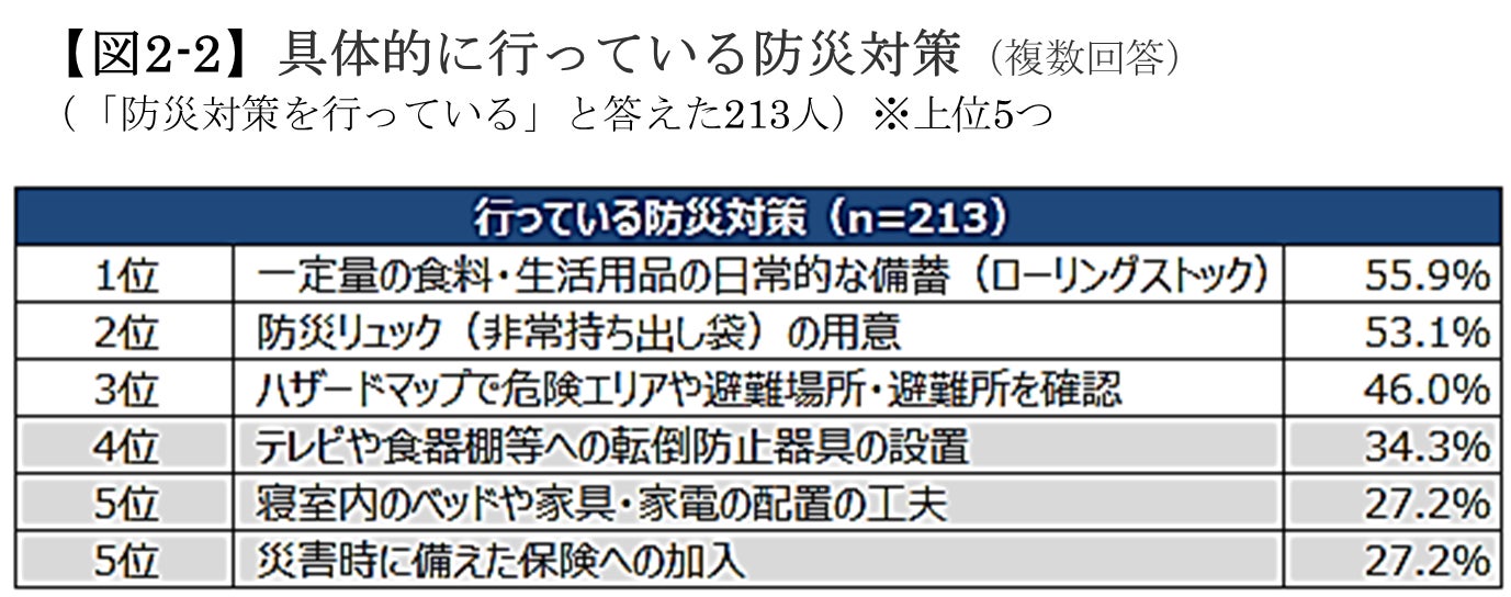 さらに、「防災対策をしている」と答えた人に、具体的な防災対策の内容について聞くと、「一定量の食料・生活用品の日常的な備蓄(ローリングストック)」(55.9%)、「防災リュック(非常持ち出し袋)の用意」(53.1%)、「ハザードマップで危険エリアや避難場所・避難所を確認」(46.0%)が上位になりました【図2-2】。防災対策として、防災用品アイテムや食料品の備蓄・ストックに加えて、もしもの時の被害や危険度の想定も重要視されていることがと見てとれます。