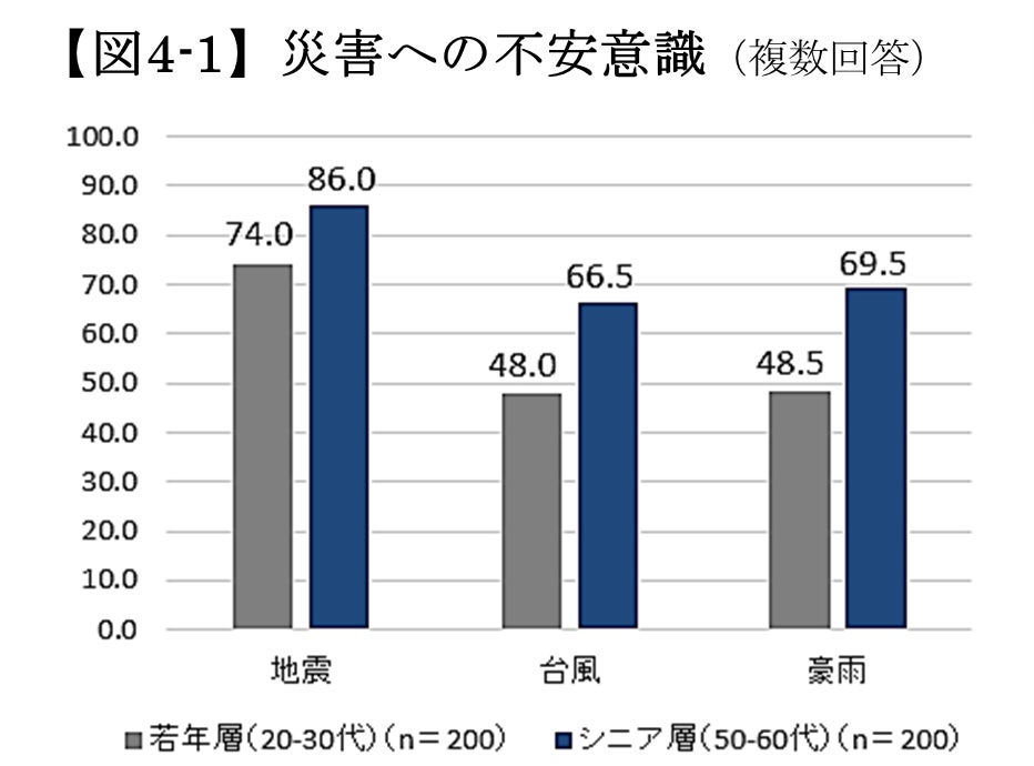 最近不安に感じている災害トップ3として、シニア層(50-60代)・若年層(20-30代)ともに「地震」「豪雨」「台風」がランクインし、いずれにおいてもシニア層の方が災害への不安意識が高い結果となりました。また、「台風」はシニア層が66.5%であるのに対し若年層は48.0%、「豪雨」はシニア層が69.5%であるのに対し若年層は48.5%とおよそ20ポイントの大きな開きがあることが分かりました【図4-1】。