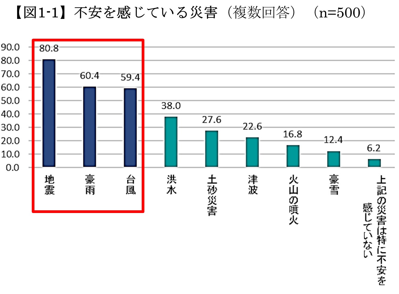 最近、どのような災害に不安を感じているかを聞くと、「地震」(80.8%)、「豪雨」(60.4%)、「台風」(59.4%)がトップ3にランクインしました【図1-1】。「地震」に対して不安を感じている人は、他の災害よりも20ポイント以上高いことが明らかになりました。