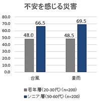 ●シニア層(50-60代)が不安を感じる災害では、「台風」が66.5%、「豪雨」が69.5%と、若年層(20-30代)よりもおよそ20ポイント高い結果になった。