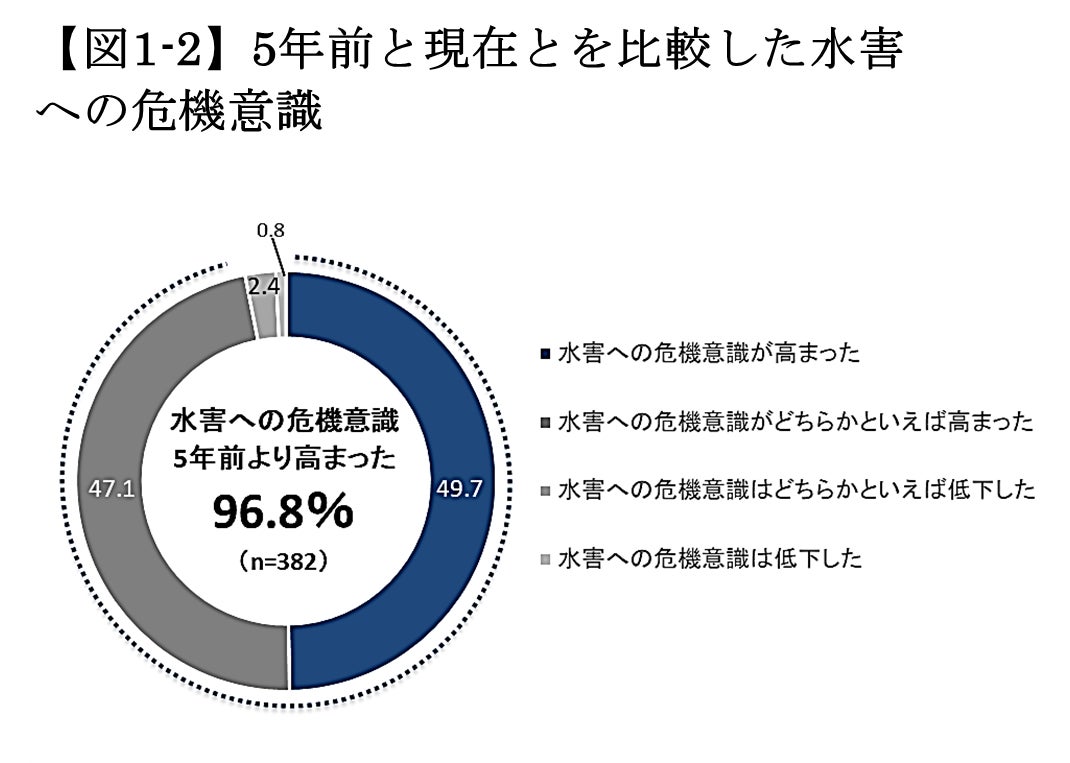 「台風」「豪雨」「洪水」のいずれかの水害に不安を感じている人に対して、5年前と比較した水害への危機意識について聞くと、「水害への危機意識が高まった」「水害への危機意識がどちらかといえば高まった」と回答した人は合計96.8%で、水害リスクを自分ごととして捉えに感じている人が増えていることが見てとれます【図1-2】。