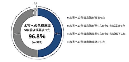 ●水害に対する意識について5年前と現在を比較した変化として、「危機意識が高まった」と回答した人は96.8%。