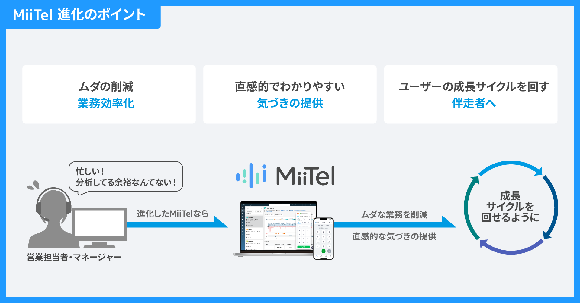 商談内容を振り返りやすいシンプルな設計なので、自ら振り返り商談の質を高めたり、開発や他部門に顧客要望をニュアンスまで正確に伝えたりすることが可能です。MiiTelは、営業担当者が「人にしかできないクリエイティブな仕事」に専念する時間を生み出します。