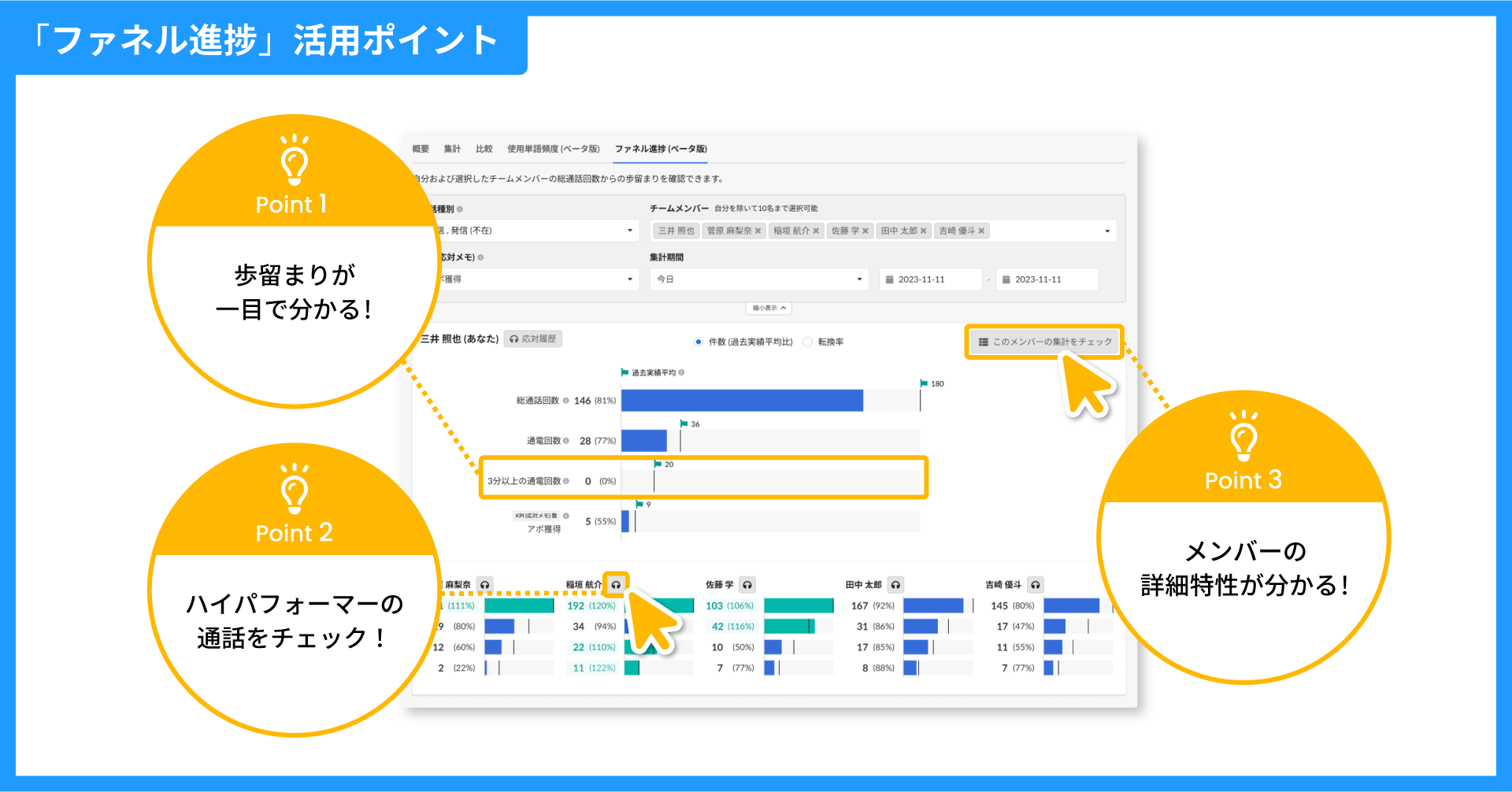 選択したチームメンバーの行動量と歩留まり状況をリアルタイムで確認することができます。メンバーの詳細の分析(集計)や、通話内容の確認もワンクリックで行えます。