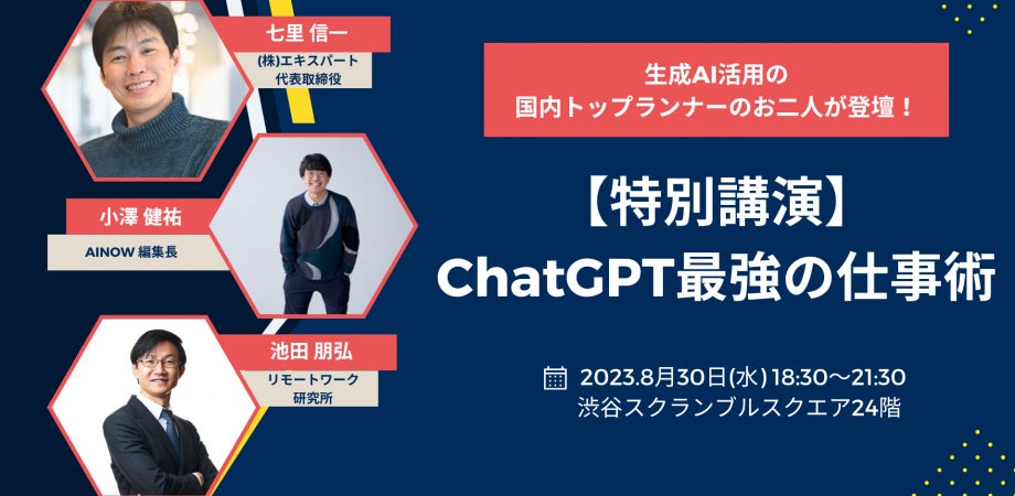 七里氏は当時の集客数日本一の6,000名の前でセミナーを、池田氏はセミナーのほか企業に対して有料で研修やワークショップをされており、今回SHIFT AI限定で特別に講演していただきます。