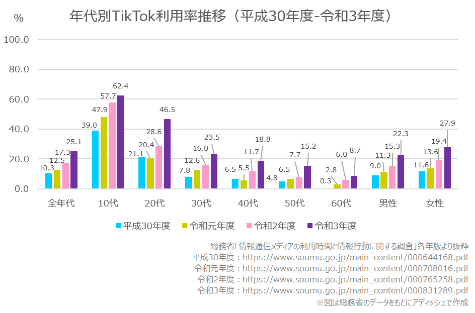 総務省の「情報通信メディアの利用時間と情報行動に関する調査」によると、特に10代および20代のTikTokの利用率が増えています。10代の利用率の推移は、平成30年度の39.0%から令和3年度は62.4%と、4年間で23.4ポイント増加しています。10代20代に限らず、あらゆる年代においても利用率が増加傾向にあることが同調査からわかります(※2)。