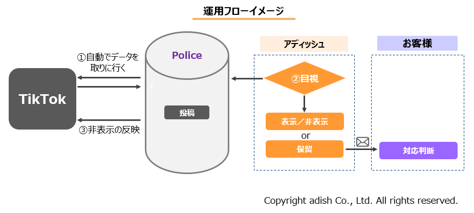 本件のシステム構築による監視業務を通じて、企業のTikTok運用におけるリスク対策を推進していきます。これまでも「Police」を利用した企業アカウントのコメント監視は、X(元Twitter)、Instagram、Facebook、YouTube、Google Business Profileを対象に行っており、TikTokの追加により6つのSNS投稿・コメント監視が実施できるようになりました。企業が運用するあらゆるSNSを、アディッシュにて一括で監視することにより、企業の危機管理体制の強化に貢献できると考えています。インターネットやソーシャルメディアなどの情報の領域が、健全で心地よい”居場所”となるよう、リスク対策の支援を一層強化していきます。
