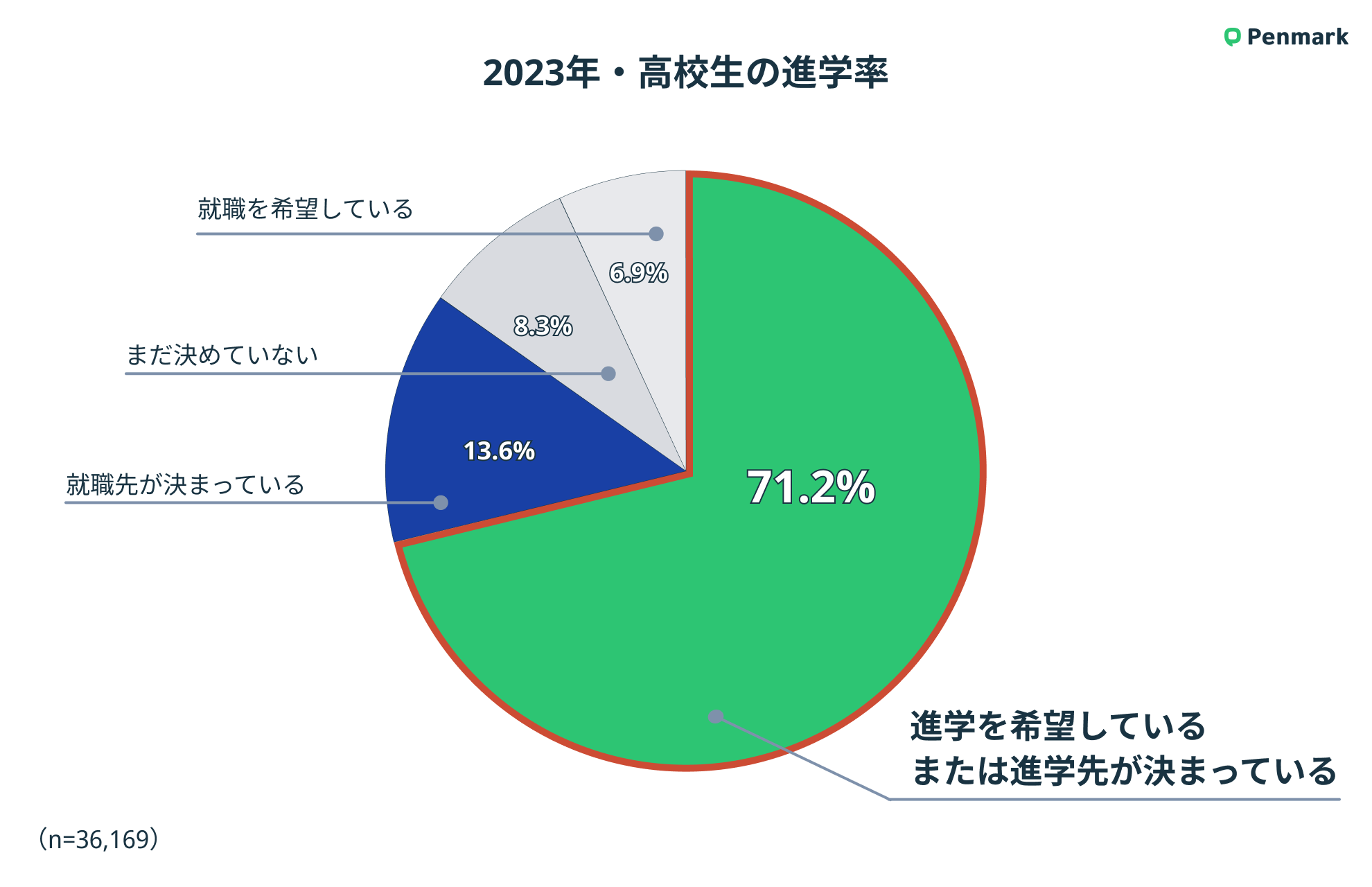 高校生の高等教育機関への進学希望率は71.2%となった(2023年2月時点)。昨年の文部科学省のデータ(2022年5月時点)では、高等教育機関への進学率は過去最高の83.8%となり、受験シーズンの2月から3月にかけて進学を選択する学生が増える傾向が伺えた。
