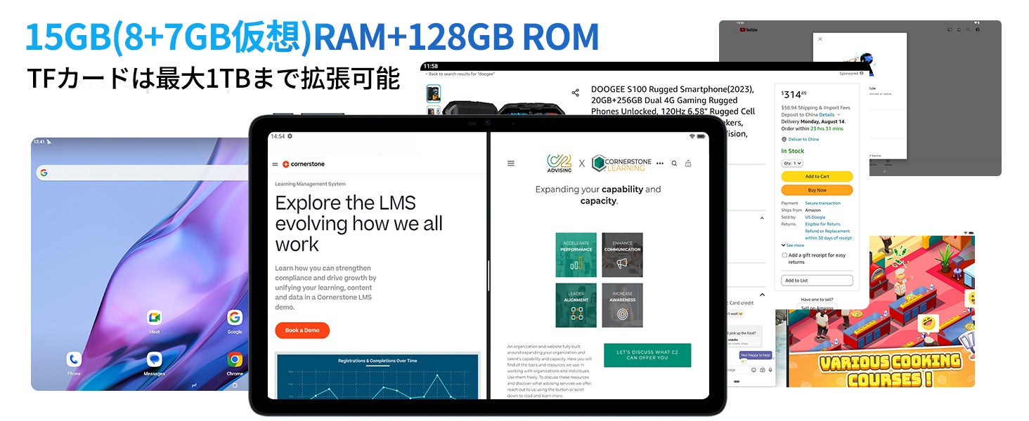 大8GBのメモリ+最大7GBの拡張可能な仮想メモリ、合計15GBの融合メモリを搭載しています。これにより、タブレットは複数のアプリケーションを簡単かつスムーズに切り替えることができ、ラグをなくし、高速でスムーズな操作体験を提供します。DOOGEE T10S アンドロイド タブレットには128GBの大容量ストレージも搭載されているため、メモリ不足を心配する必要はもうありません。 大容量の1TBまでのmicroSDカードでストレージ容量をさらに拡張できます。