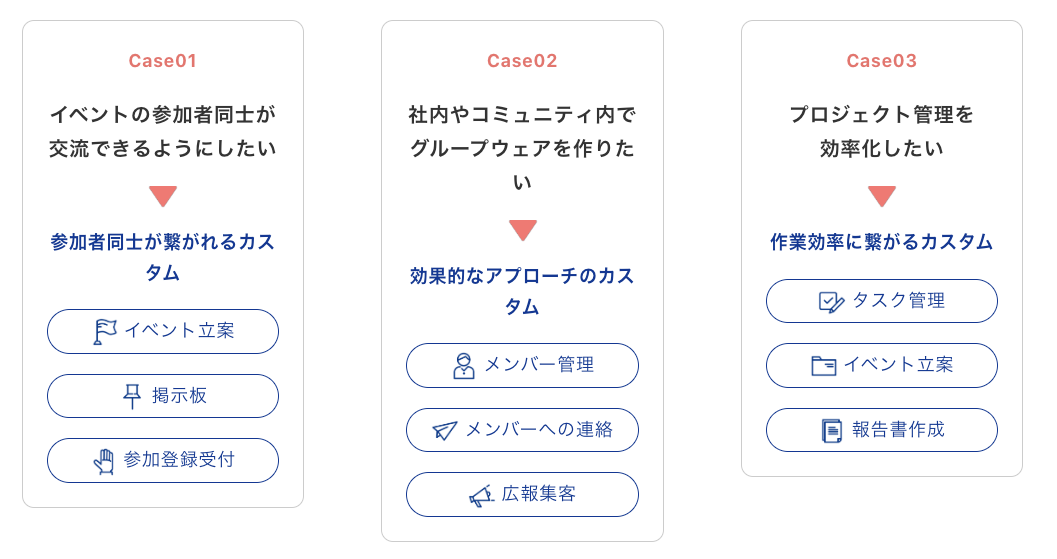 内容:標準機能(イベント管理、プロジェクト管理、コミュニティ管理)がすべて利用可能