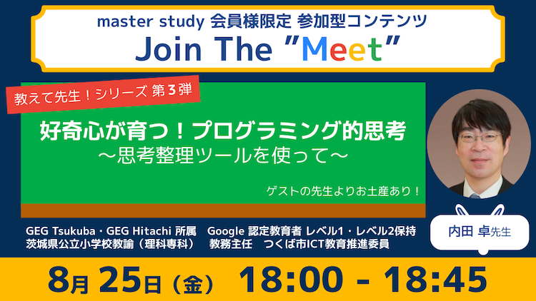 8月25日(金)に開催する待望の第3弾は、 つくば市ICT教育推進委員を務められ、公立小学校の教務主任としてご自身でも多くのICTを活用した実践をされている内田 卓(うちだ すぐる)先生をゲストにお迎えします。