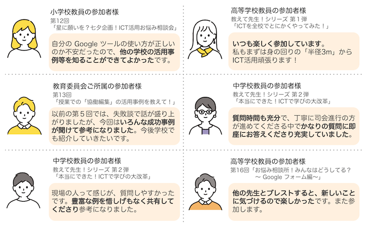毎回、皆様から寄せられた学校のICT活用についての質問やお困りごと、事例共有をテーマに、講師や参加者の皆様でざっくばらんに情報をシェアするコミュニティです。