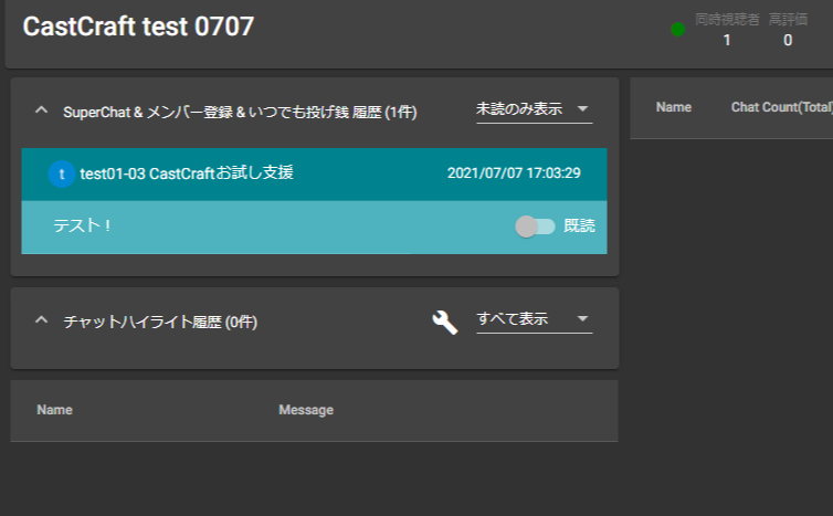 配信で行われた未読スパチャ、いつでも投げ銭、メンバーシップ参加などの重要情報をコメントビューアー上部に固定しておき、読み上げたかどうかの既読管理ができます。
