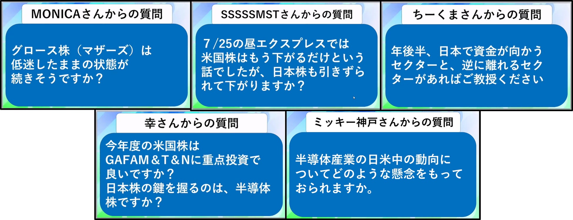 ・投資手法から宮島さんご自身に関することまで、さまざまな質問にお答えいただく日経CNBCのインターネット限定番組です。(下の画像は7/27配信の第4回のものです)
