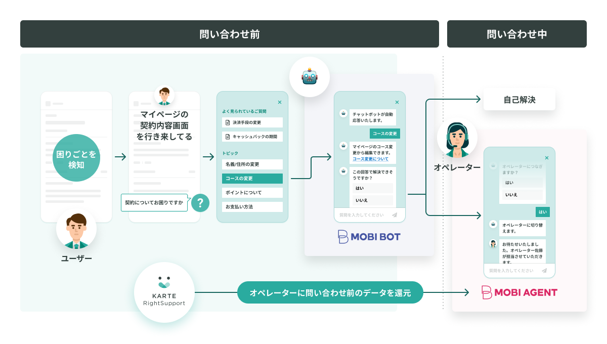 KARTE RightSupportで顧客の問い合わせ前行動を元に課題を把握し、最適なタイミングで「MOBI BOT」を起動でき、またチャットボット内の文言や選択肢も顧客ごとに合わせて提供することができます。
