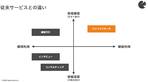 クイックリサーチは「情報の鮮度」と「継続活用」が特徴となっております。