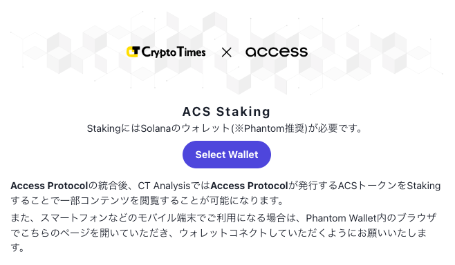 CT Analysisのサブスクリプションサービスは、4月1日より開始。これまでのクレジットカード支払いだけでなく、今回の統合により、Access Protocolを利用してSolanaのPhantom WalletとACSでステーキングを行うことで一部有料コンテンツへのアクセスが可能になりました。