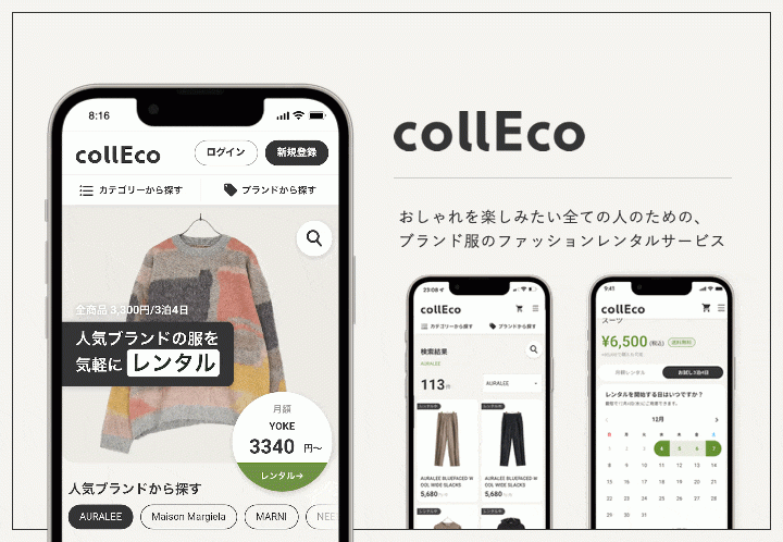ファッションレンタルサービス「collEco(コレコ)」では、パソコンはもちろんスマホから誰でも簡単に国内外の人気ブランドの洋服が借りれるサービスです。今季の新作や定番アイテムを、数日間のお試しから月額制の長期利用まで、必要な期間だけ自分のものにできます。当サービスを利用していただき、気に入っていただいたアイテムはそのまま購入も可能となっております。好きな洋服を好きな時に気軽に試せることで、定期的に何度も利用して下さるユーザー様も多くアクティブユーザー数も着実に伸びてきています。