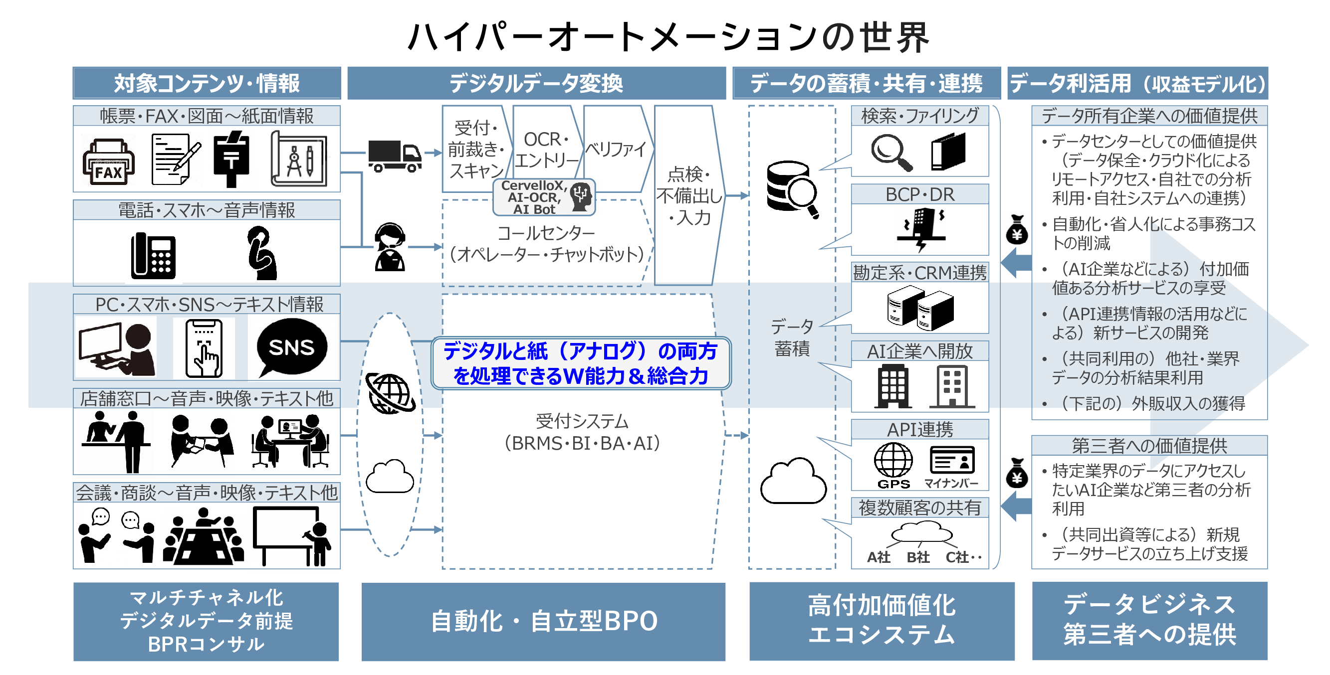 ントBPO)を通じ、お客様の業務改⾰・DXソリューションを提供しています。DX推進過程で躓きやすいコア業務の自動化・デジタル化・クリーンデータ⽣成(各種伝票や申請書内容のデータ化と点検/精査)については数多くの実績を持ち、現場で培った独⾃ノウハウを活用した業務コンサルティングや、より⾼度な⾃動判断を実現するAIアプリケーション基盤を⾃社開発しています。