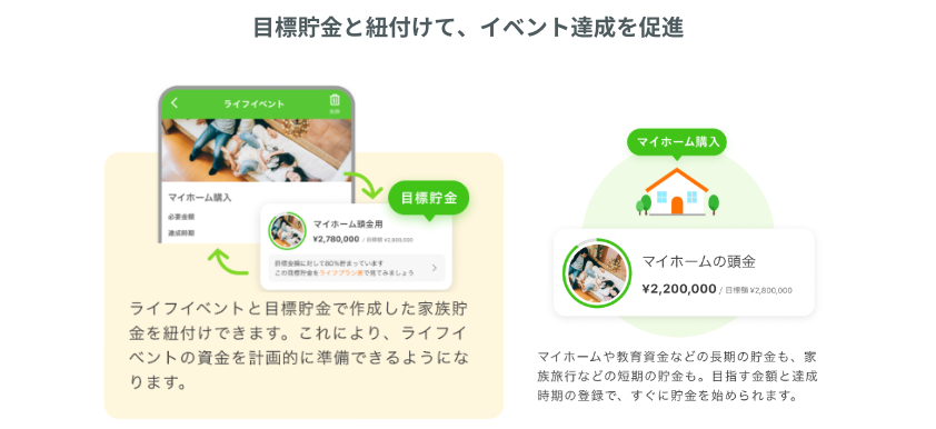 夫婦で家族の将来のために目標を設定して貯金できる機能も搭載されています。