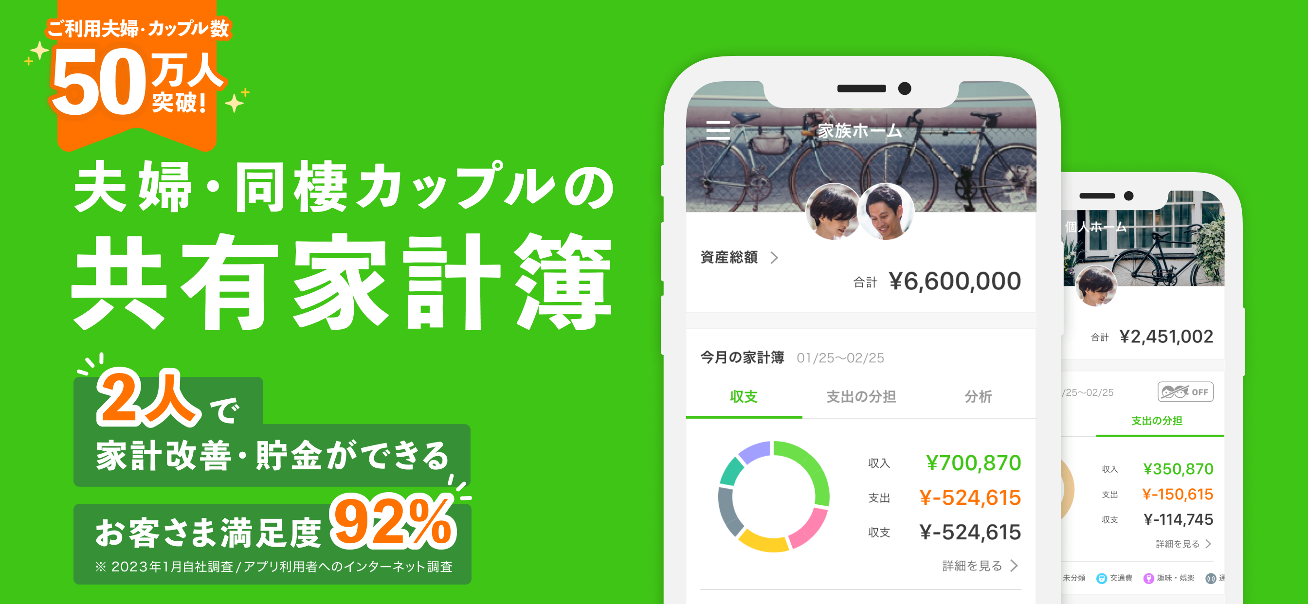 夫婦のお金は家族ページで共有し、個人のお金は個人ページでプライバシーをもって分別管理できます。