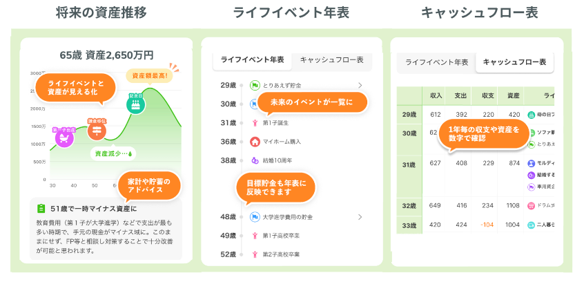 出産、住宅購入、老後資金といったライフイベントを選択して目標時期を設定すると、ライフイベント年表に家族のライフイベントが反映されます。それらのイベントに向かい、夫婦で一緒に資金を準備していくことができます。