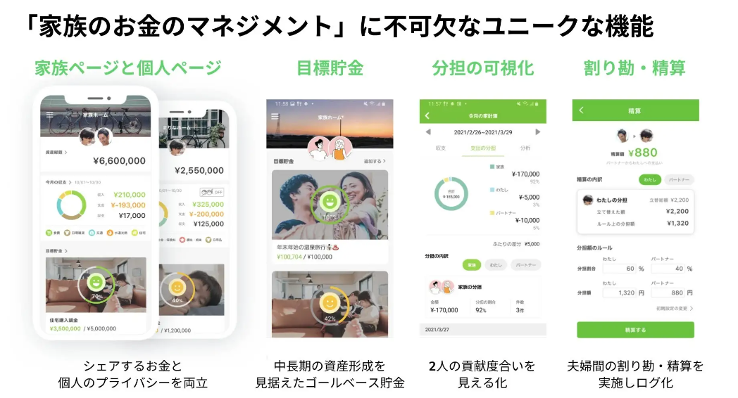 夫婦で誰が何をいくら払ったかを可視化できる、夫婦間で立て替えの精算をできる、等の夫婦向けならではの機能が搭載されています。