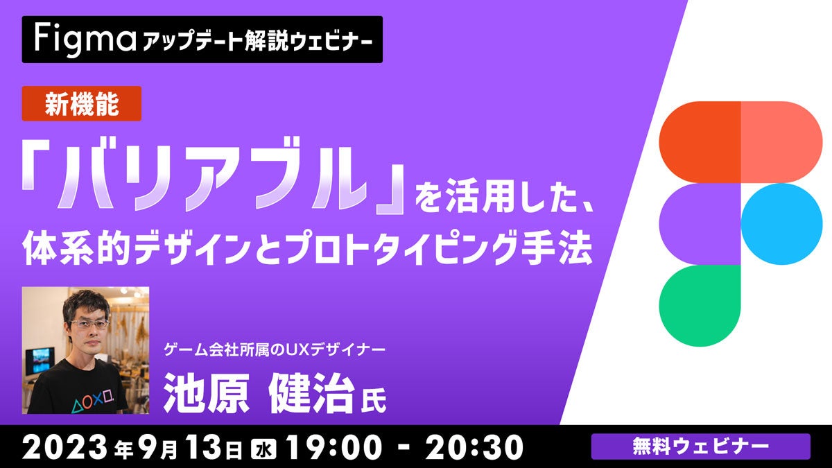 当日のゲストには、SNSでの情報発信やセミナーへの登壇など、幅広く活動されているUXデザイナーの池原健治氏をお迎えし、アップデートの詳しい内容のほか、新機能「バリアブル」を活用した体系的デザインとプロトタイピング手法をご紹介いただきます。Figmaは使っているけどアップデートに関してよく知らなかった方やより深くFigmaを理解したい方におすすめの内容です。ご興味をお持ちの方はお気軽にご参加ください。