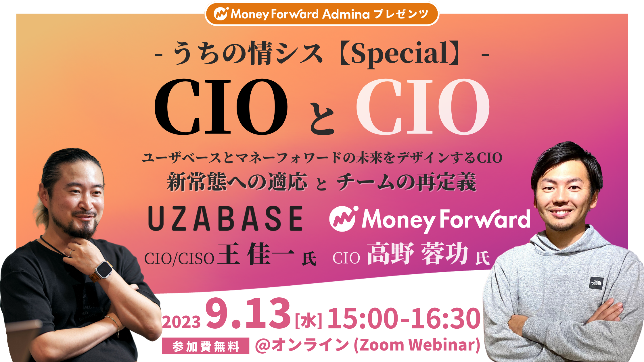 本イベントは、「コーポレートITのサクセス」をテーマに、ソーシャル経済メディア『NewsPicks』を運営するユーザベースのCIO 王 佳一氏と、マネーフォワードCIO 高野 蓉功が対談するオンラインイベントです。