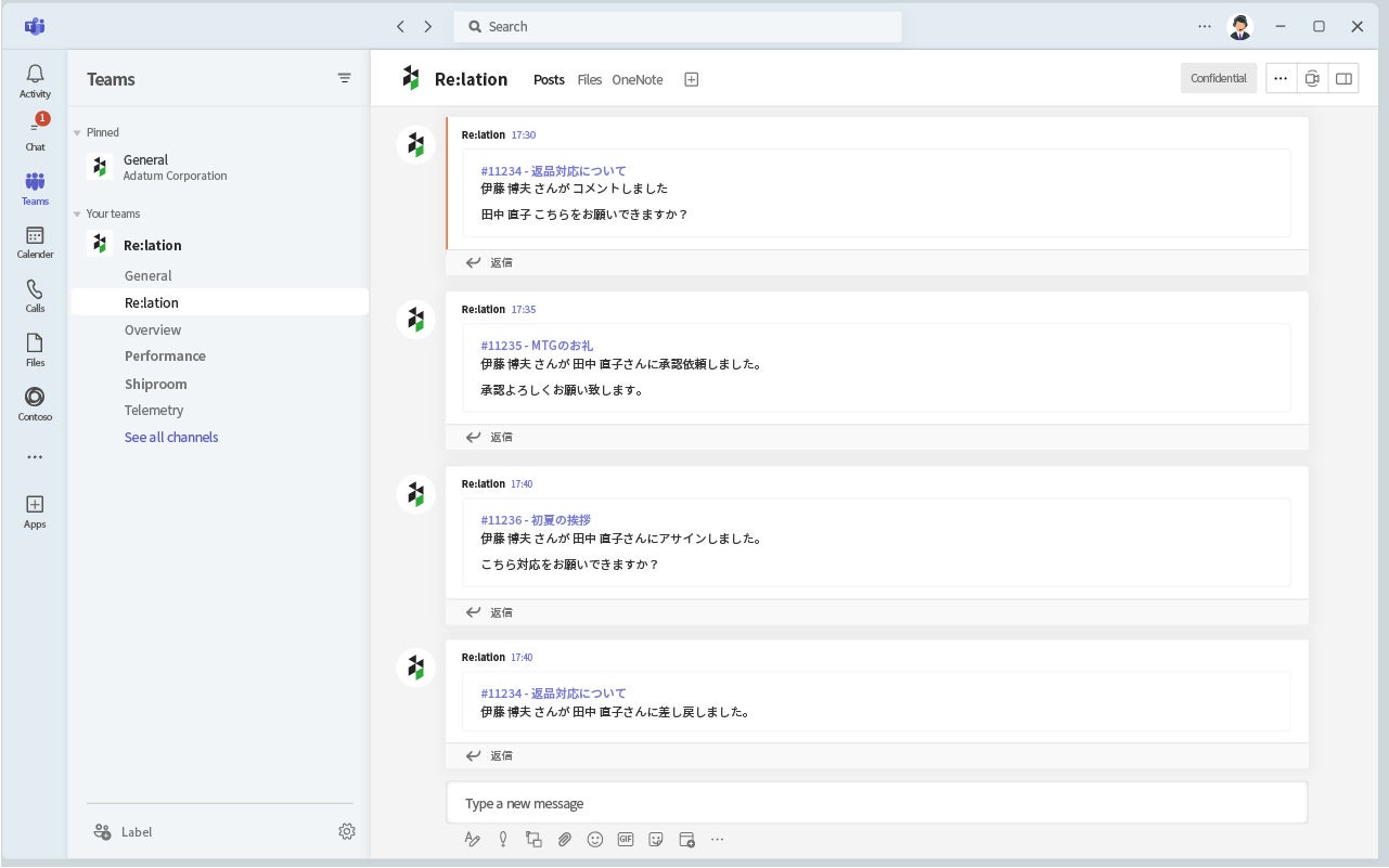 『Re:lation』上でコメントや承認依頼、担当者設定などを行った際の通知をTeamsのチャットで受け取ることができます。即時にアクションに気づくことができるため、通知の見逃しを防ぎ、よりスムーズに顧客対応を進めることができるようになります。