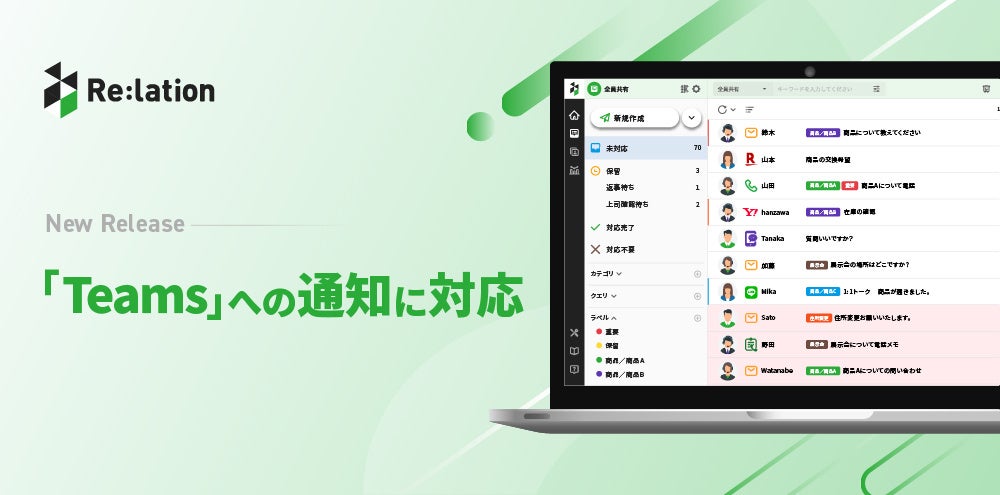 『Re:lation(リレーション)』は、複数の問い合わせ窓口を一元管理し、チームで共有できる顧客対応クラウドです。メール、電話、チャット、LINEなど多様化するコミュニケーションサービスを一つの画面で扱えるため、顧客との接点が増え複雑になった問い合わせを簡単に一元管理できます。さらに、二重返信や対応漏れを防止するステータス管理やWチェックが簡単にできる承認機能といった、複数人での問い合わせ対応で生じがちな様々な課題を解決する機能を備えています。テレワークなど多様な働き方にも対応し、業務効率化・可視化を実現して人材教育にも貢献します。