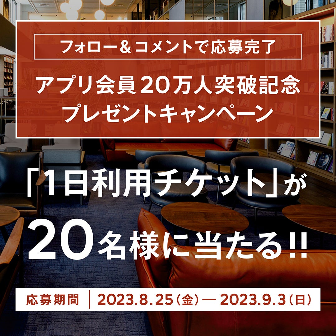 「SHARE LOUNGE」の公式InstagramまたはX(旧Twitter)をフォローし、下記参加条件を満たした方の中から抽選で20名様に「SHARE LOUNGE」1日利用チケットをプレゼントいたします。