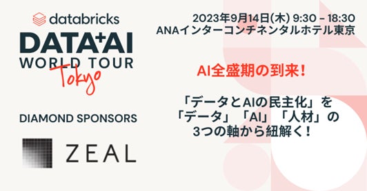 「Data + AI ワールドツアー東京」は、Enterprise Data + AI Platformを活用した「データとAIの民主化」によるビジネス価値の創出をテーマに開催されるもので、「データ」「AI」そして「人材」といったテーマを軸に、カスタマーセッション、スポンサーセッション、展示ブースなどが展開される予定です。ジールはダイヤモンドスポンサーとして本イベントに参加をし、以下に記載の内容にて講演(ライトニングトーク)とブース展示をしますので、ぜひお申し込み・ご来場ください。