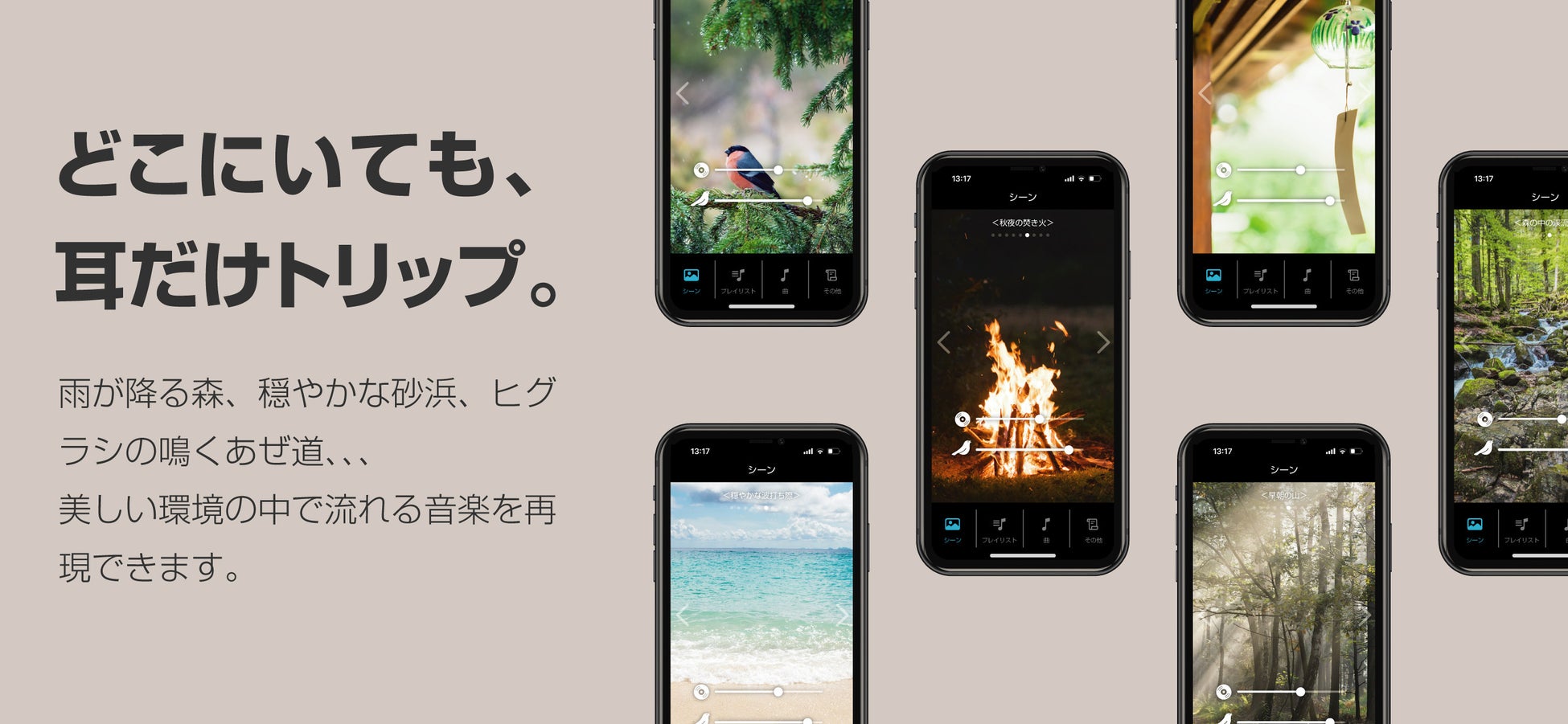日常生活に追われる方が少なくない昨今、聴覚だけでも「トリップ」して非日常的な体験をしていただきたいという思いから今回のアプリ開発に至りました。自然の音とあわせてお手持ちの楽曲を重ねることで、目をつぶると「自然の中で演奏を聴いているかのような体験」をすることができます。