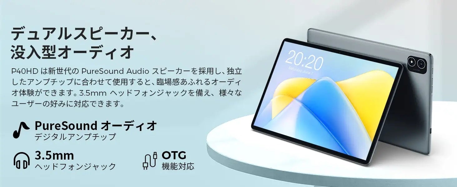 6000mAhの大容量リチウムイオン電池と低消費電力のプロセッサーにより、最大7時間のビデオ継続時間を実現しています。正面と裏面を区別しないType-C充電ポートで、充電が簡単に。新世代のPureSound Audio スピーカーを採用し、独立したアンプチップに合わせて使用すると、臨場感あふれるオーディオ体験ができます。3.5mmヘッドフォンジャックを備え、様々なユーザーの好みに対応できます。