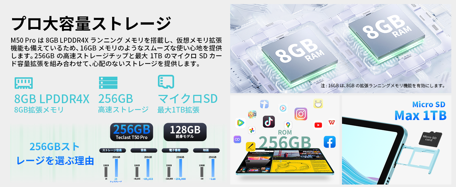 8GB LPDDR4Xランニングメモリを搭載し、8GBの仮想メモリ拡張機能も備えているため、合計16GBのメモリはスムーズな使い心地を提供できます。256GBの高速ストレージチップと最大1TBのマイクロSDカード容量拡張を組み合わせて、心配のないストレージを提供します。6000mAhの大容量バッテリーとAIスマートパワーマネジメントで、最大7時間の動画再生が可能です。
