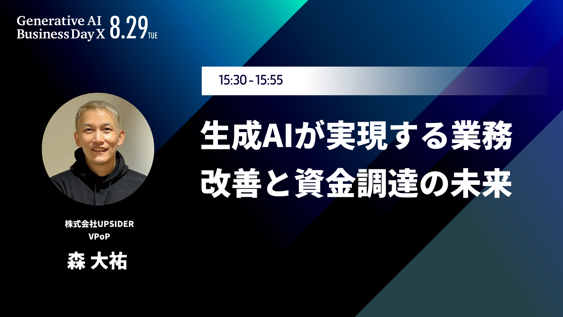 ChatGPTや生成AIのビジネス活用・事例を学ぶビジネスパーソンのための祭典「Generative AI Business Day X」に、当社 森が登壇します。森は「生成AIが実現する業務改善と資金調達の未来」をテーマにお話しする予定です。