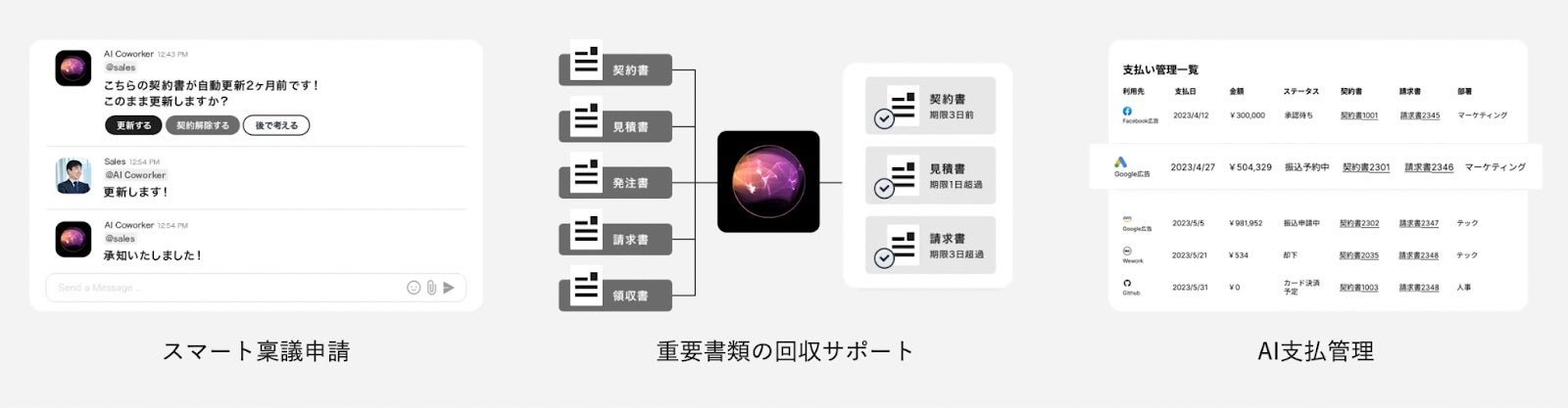 AI Coworkerは、当社が8月末のリリースを予定しているAIチャット形式の業務効率化ツールです。契約書管理システムや会計システムなどの外部ツールとチャットツール「Slack」を連携し、契約書の締結・稟議申請および承認・支払管理などのアクションをAIがチャットツール上で強力にサポートしてくれます。また、AIが企業の申請ルール、組織図などを学習し、従業員の役割に応じたリマインドや各ツール間のデータの突合などを代行します。