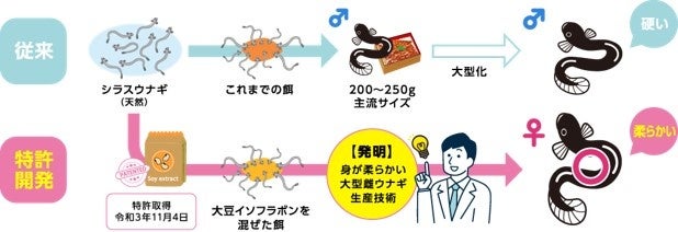 うなぎ生産量全国第2位(2021年)である愛知県は、大豆に含まれる大豆イソフラボンをうなぎに与えることで「大きくて、やわらかくて、おいしいうなぎ」の生産技術を、関係団体などとの共同研究により2020年に開発いたしました。2021年には特許を取得(2022年2月8日発表)。2024年の1月以降、本技術を用いて生産されたうなぎが出荷され、西尾市内で限定販売される予定となっております。